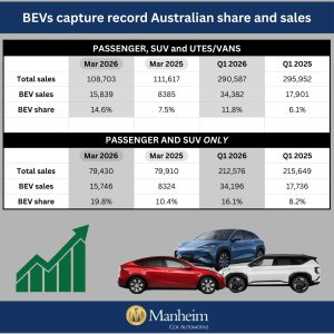 Almost one-in-5 passenger cars and SUVs sold new in Australia in March 2026 were fully electric. The 19.8% market share captured by BEV passenger cars and SUVs equalled just under 16,000 sales, almost double March 2025’s tally.